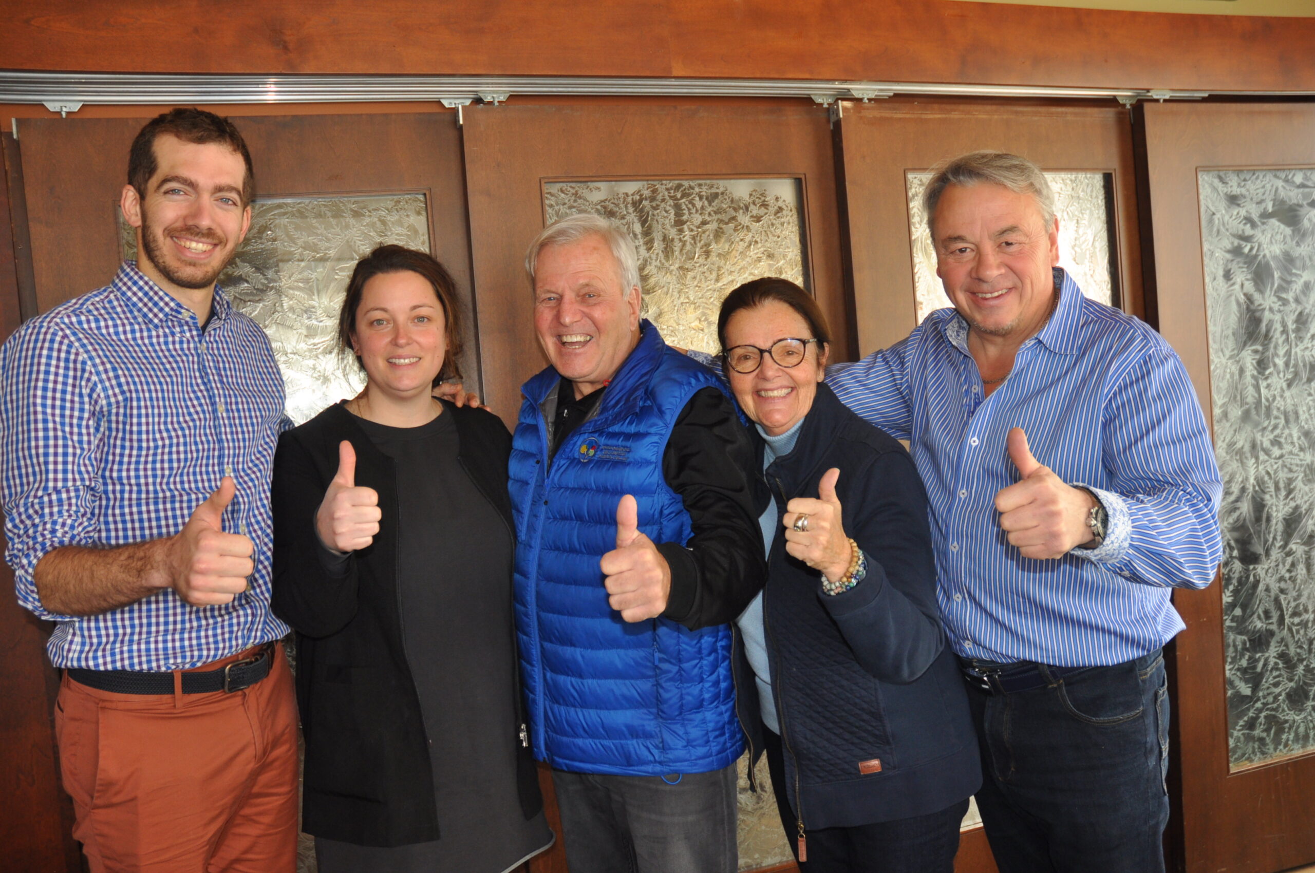 Daniel Desjardins, DG de la Fondation, le maire de Mont-Tremblant, Luc Brisebois, Michel Rochon, président de la Fondation, le maire de Sainte-Agathe Frédéric Broué et Michèle Lemay des loisirs du PPL. Ils sont accompagnés de Mme Clémence Garneau et Mme Jacqueline Kennedy, épouse de M. Richard Kennedy, l’instigateur du projet, qui est malheureusement décédé quelques jours avant de pouvoir en faire l’essai.