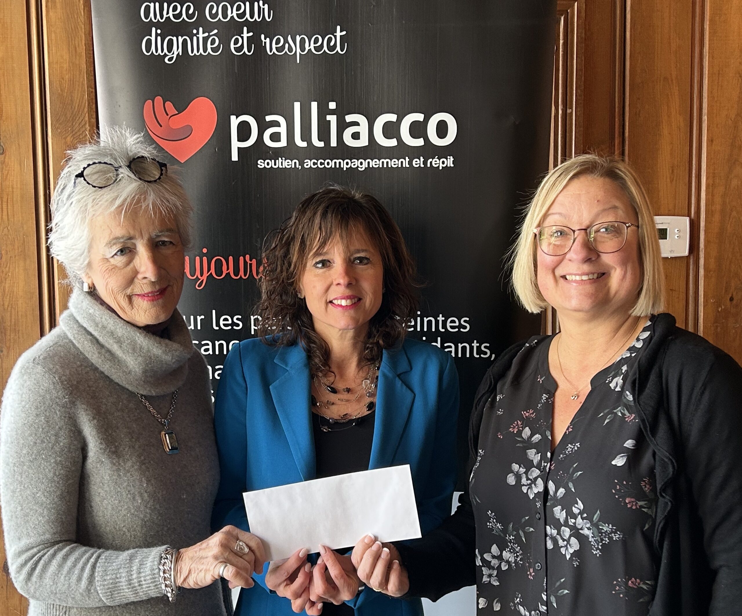 Nancy Cadieux, membre du Conseil d’administration de la Fondation, remet le chèque de 30 000$ à Maryse Brunet-Lalonde, présidente du CA de Palliacco et Chantal Roy, directrice générale de Palliacco.