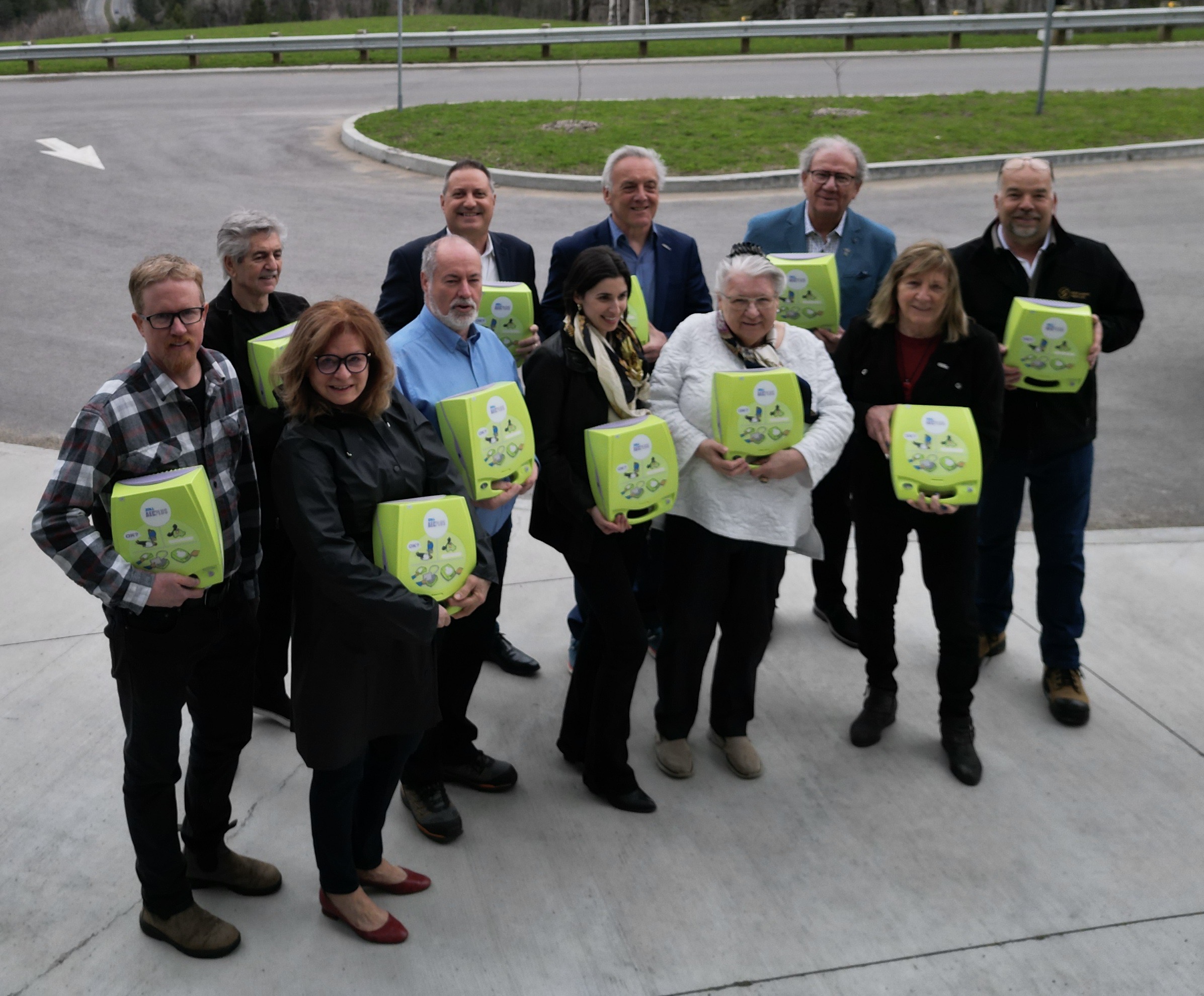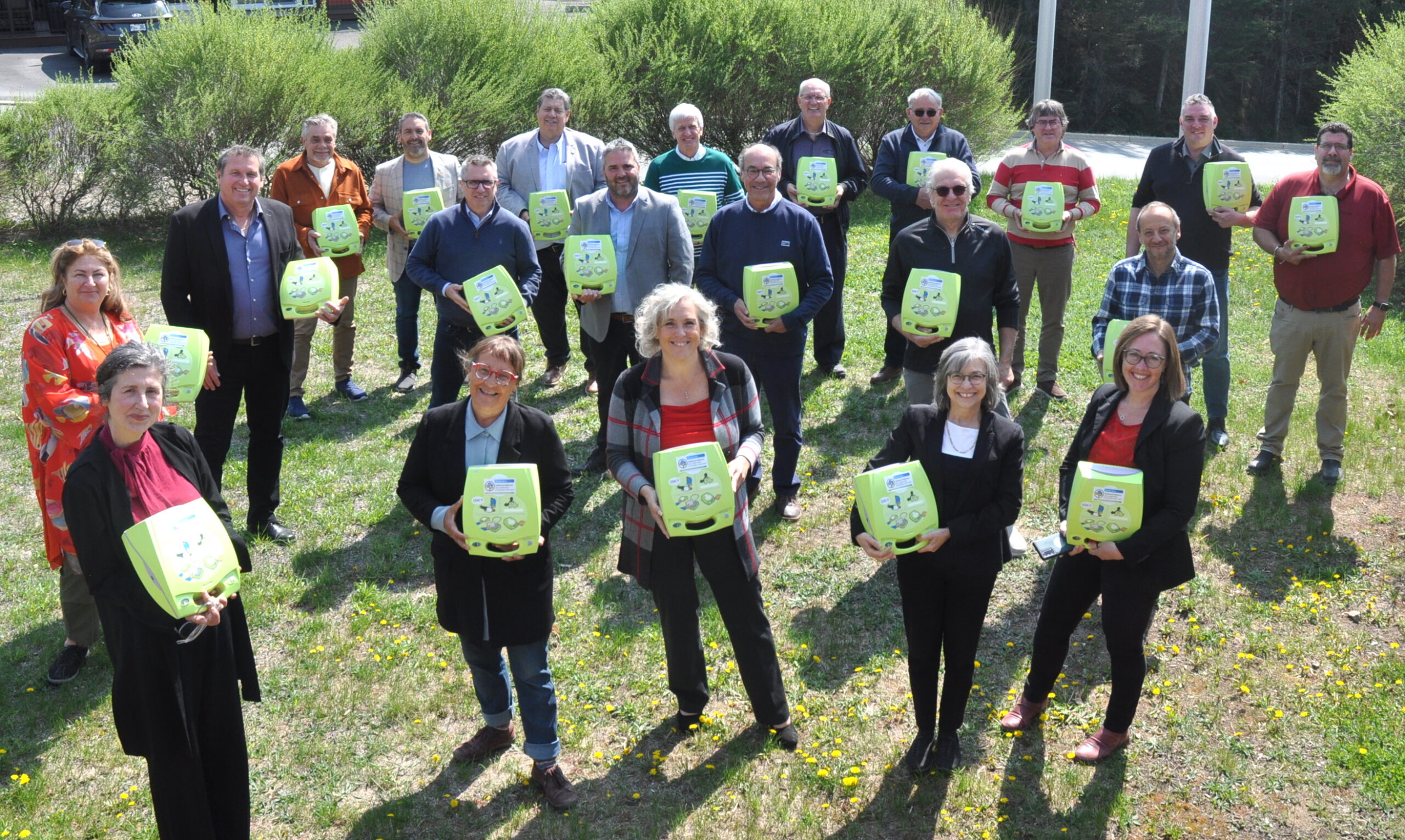 Les maires et le préfet de la MRC des Pays-d’en-Haut recevant les premiers défibrillateurs .