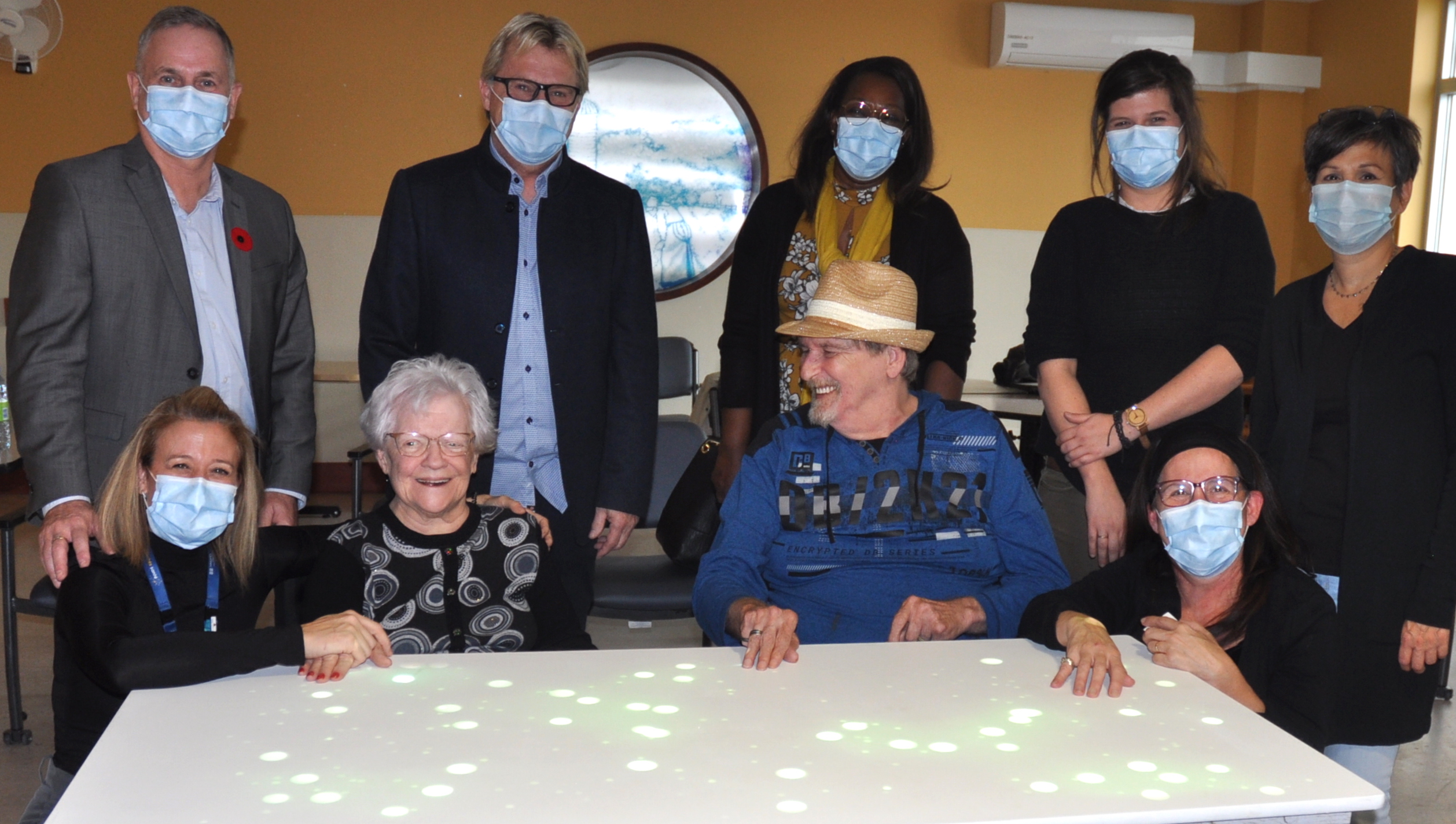 La console de jeu procure de la joie et du divertissement. Sur la photo, rangée arrière : Gilles Doyon gestionnaire responsable du Pavillon Philippe-Lapointe, Daniel Desjardins DG de la Fondation, Cherley Casséus gestionnaire au CHSLD des Hauteurs, Alix Harvey technicienne en loisirs à la future maison des Ainés de Sainte-Agathe et Lisa Frigon préposée aux loisirs au CHSLD des Hauteurs. Rangée avant : Michèle Lemay préposée aux loisirs au Pavillon Philippe-Lapointe, Alice Constantineau résidente au PPL, Yves Lapierre résident au PPL et Guylaine Terreault monitrice aux loisirs au CHSLD Labelle-Mont-Tremblant.