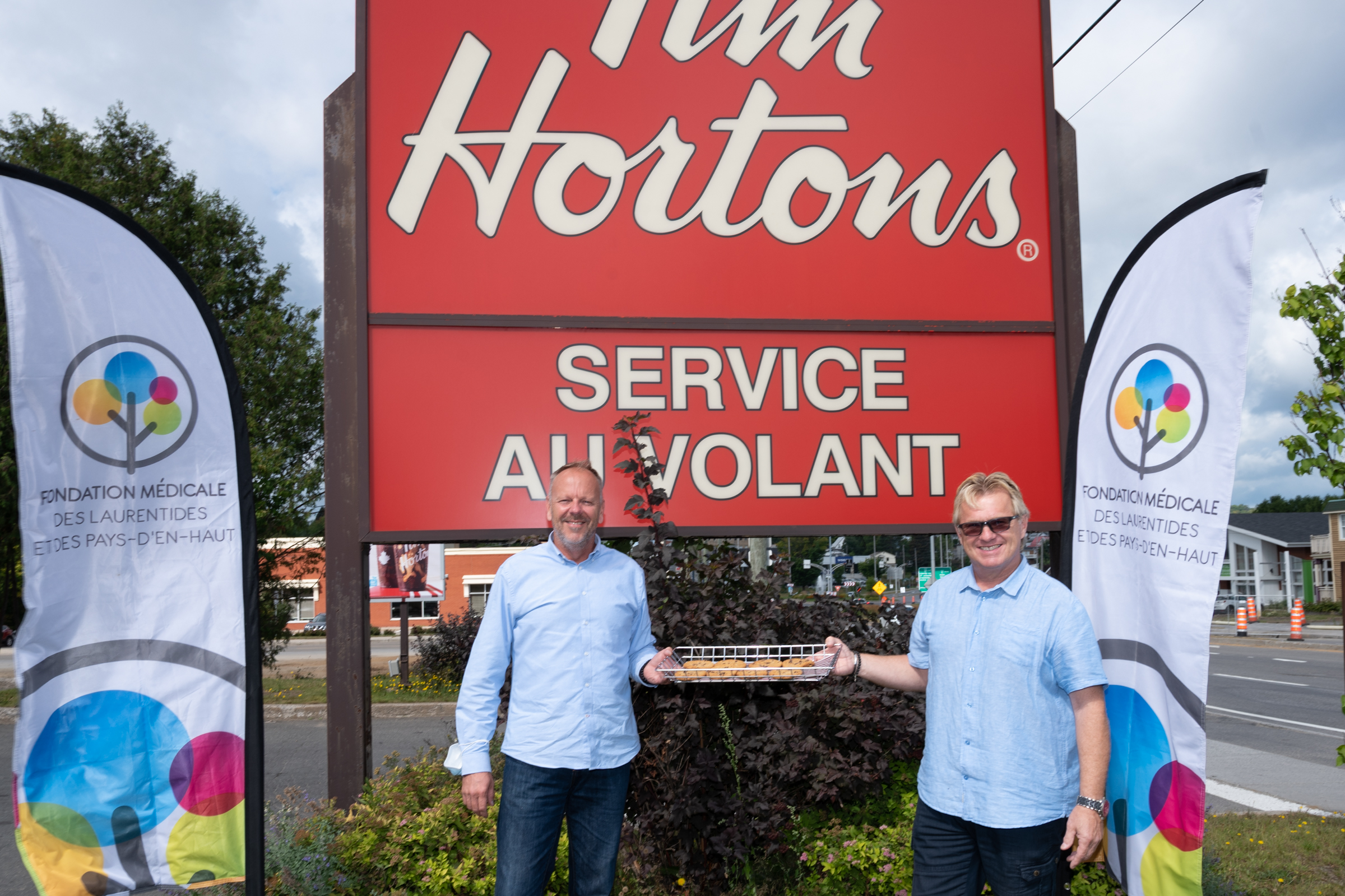 Le propriétaire des restaurants Tim Hortons Sainte-Agathe, Saint-Sauveur et Piedmont Yves Forget et la DG de la Fondation Daniel Desjardins vous invitent à déguster un succulent Biscuit Sourire pour améliorer les équipements et services de santé de proximité.