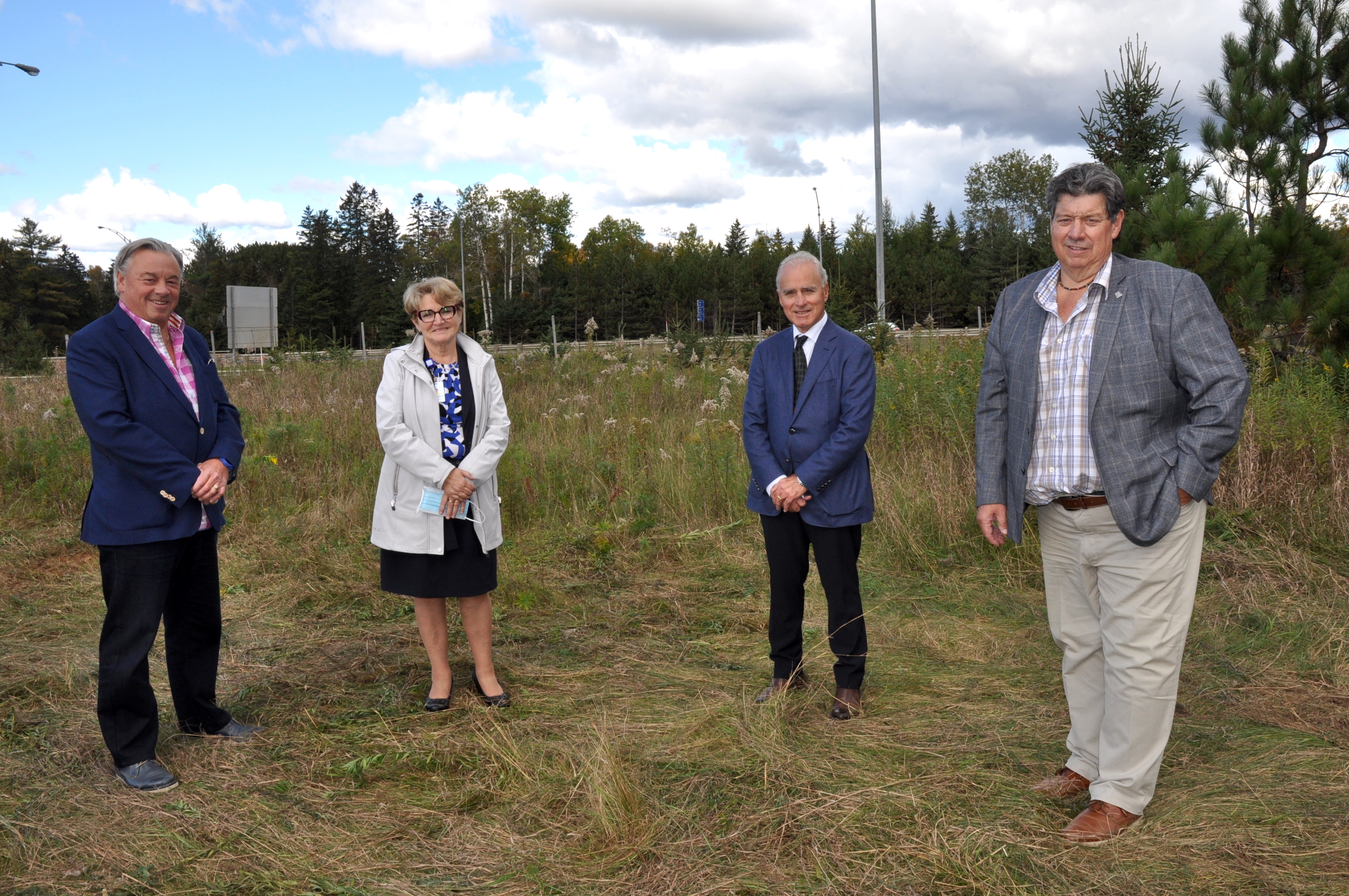 Le terrain donné par Monsieur Giuseppe Racanelli est fort bien situé près de l’intersection des routes 117 et 327. De gauche à droite Michel Rochon (président de la Fondation), Madame Rosemonde Landry (présidente – directrice générale du CISSS des Laurentides), Monsieur Racanelli et Monsieur Luc Brisebois (maire de Mont-Tremblant).