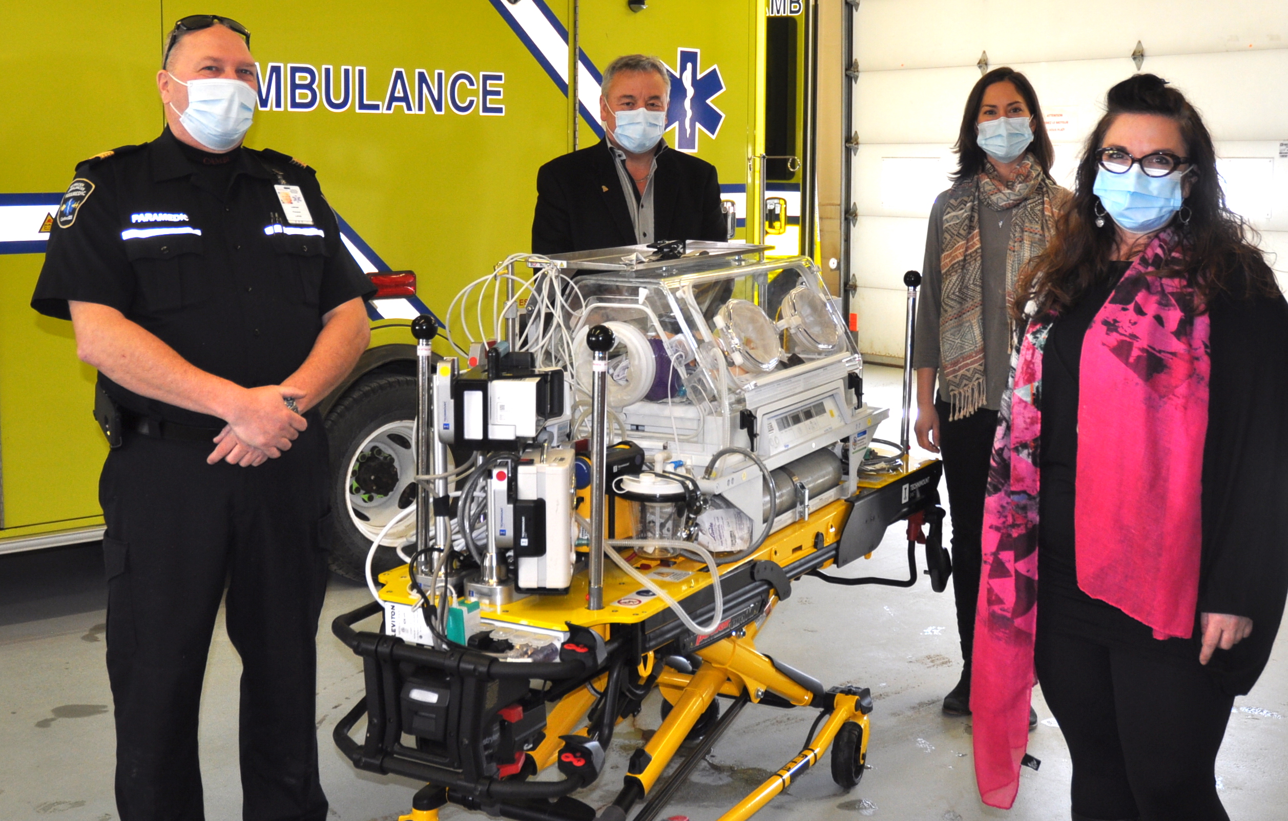 Le nouvel équipement inédit acquis par la Fondation médicale est arrivé dans les derniers jours. Sur la photo : François Larose (superviseur régional Ambulances CAMBI), Michel Rochon (président de la Fondation médicale), Dre Marie-Pierre Chalifoux (instructeur de réanimation néonatale) et Nathalie Drouin, chef de l’Unité des naissances et périnatalité du Nord.
