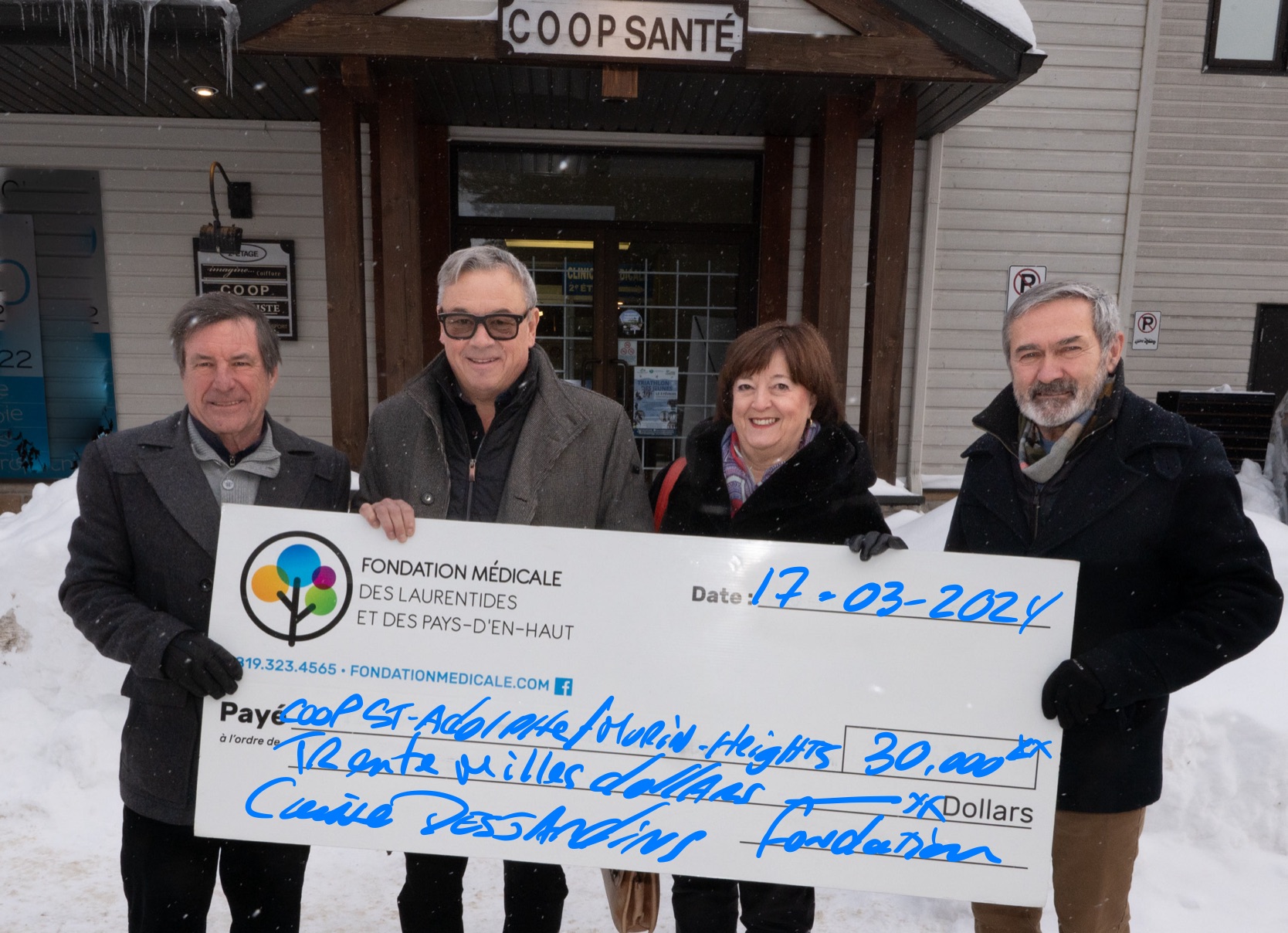 (De gauche à droite) Me François Bertrand président de la Caisse Sainte-Agathe-des-Monts, M. Michel Rochon président de la Fondation médicale, Mme Monique Éthier présidente de la Caisse de la Vallée des Pays-d’en-Haut accompagnant le président des COOP de St-Adolphe et Morin-Heights, M. Didier Huysecom.